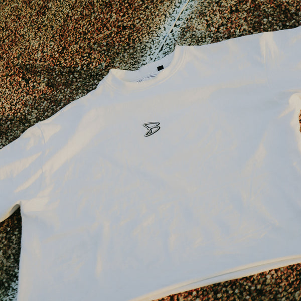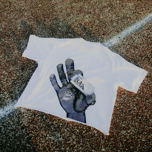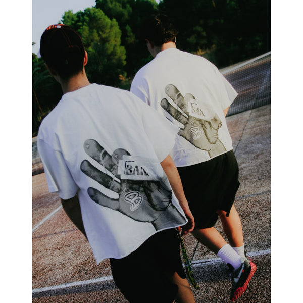 Camiseta blanca 100% algodón con corte oversize.Gráfico trasero unico de una mano en escala de grises sujetando una cuchilla con el logo de nuestra marca, símbolo de la crudeza de la calle. MODELO DE LA DERECHA TALLA M ALTURA 183CM...